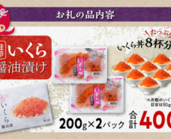 北海道白糠町のふるさと納税の返礼品 北海道白糠町のふるさと納税の返礼品『いくら醤油漬(鮭卵)【400g(200g×2)】』を紹介します。寄付金は、13,500円です。 ロシア産の鮭卵から製造された『いくら醤油漬(鮭卵)』・・・