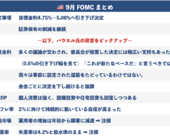 9月のFOMCでは従来予想となった0.25%ではなく、0.5%の大幅利下げとなりました。 パウエル議長の発言で繰り返されたのは、今後の利下げペースも会合ごとに決定していくとのことであり、FOMCの金利予測分布図(ドットプ・・・