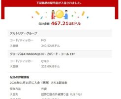 こんにちは。時短父さんです。 昨夜、今年一発目の配当金・分配金の入金がありました。 アルトリア・グループ(MO)から240.52ドル、グローバルX ナスダック100・カバード・コールETF(QYLD)から226.69ドル・・・