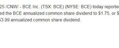 こんにちは。時短父さんです。 カナダの通信会社であるBCE(BCE)が減配を発表しました。 内容は以下です。 一株あたり年間配当を従来の3.99ドルから1.75ドル、四半期配当だと0.4375ドルにするとのこと。 56%・・・