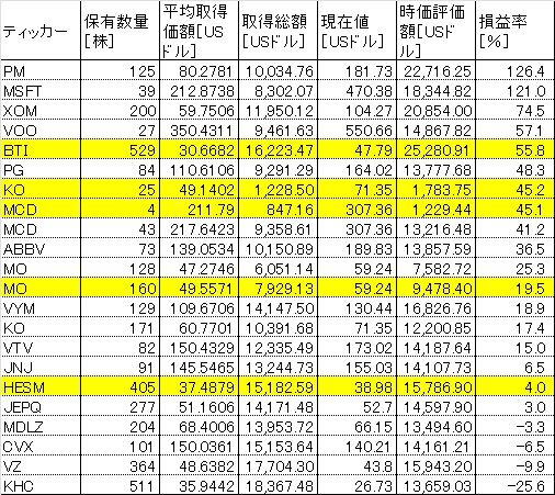 損益率が最高なのはPMで+126.4%、最低なのはKHCの-25.6%でした。100%超えはPMとMSFTの2銘柄です。つまりドルベースでダブルバガーです。