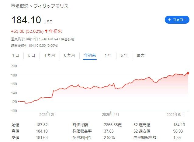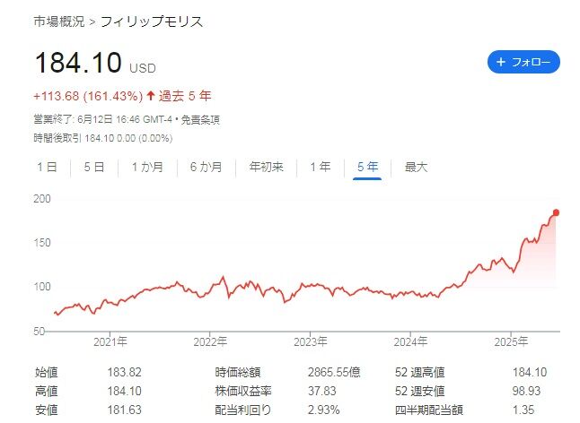 たばこ大手のフィリップ・モリス・インターナショナル(PM)の株価がとんでもないことになっています。