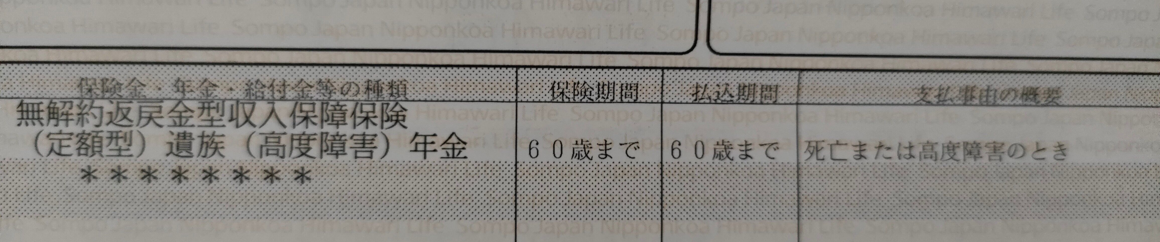 私が加入している保険は、「無解約返戻金型収入保障保険」というもので、保険期間は60歳まで、払込期間も60歳までとなっています。支払事由は、私が死亡するか高度障害となった場合です。