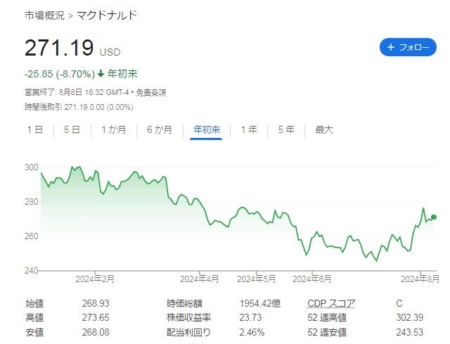 現在株価は271.19ドルで、年初来では8.7%安です。直近の底値は脱したように見えますね。