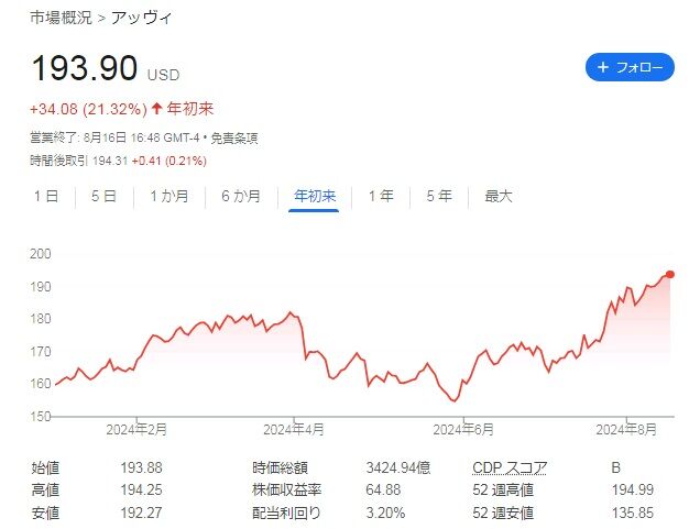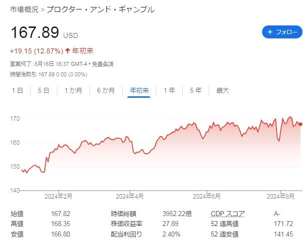 直近株価は167.89ドルで、最高値付近にいまして、年初来では13%弱の上昇となっています。はいとう利回りは2.40%です。