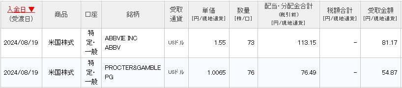 アッヴィについては、単価1.55ドル、数量73株、税引き前113.15ドル、税引き後81.17ドルでした。