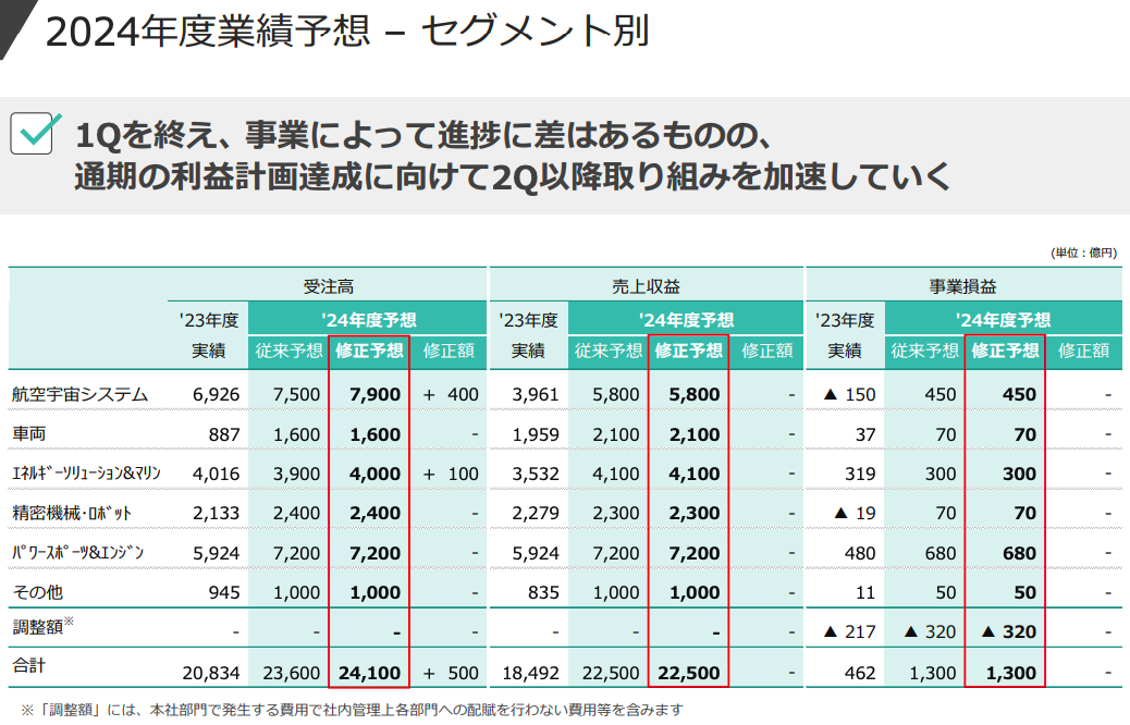 三菱重工の事業は以下4つの事業で編成されますが、うち航空・防衛・宇宙事業の受注高は全体の29%、事業利益で見ると全体の22%を占めています。
