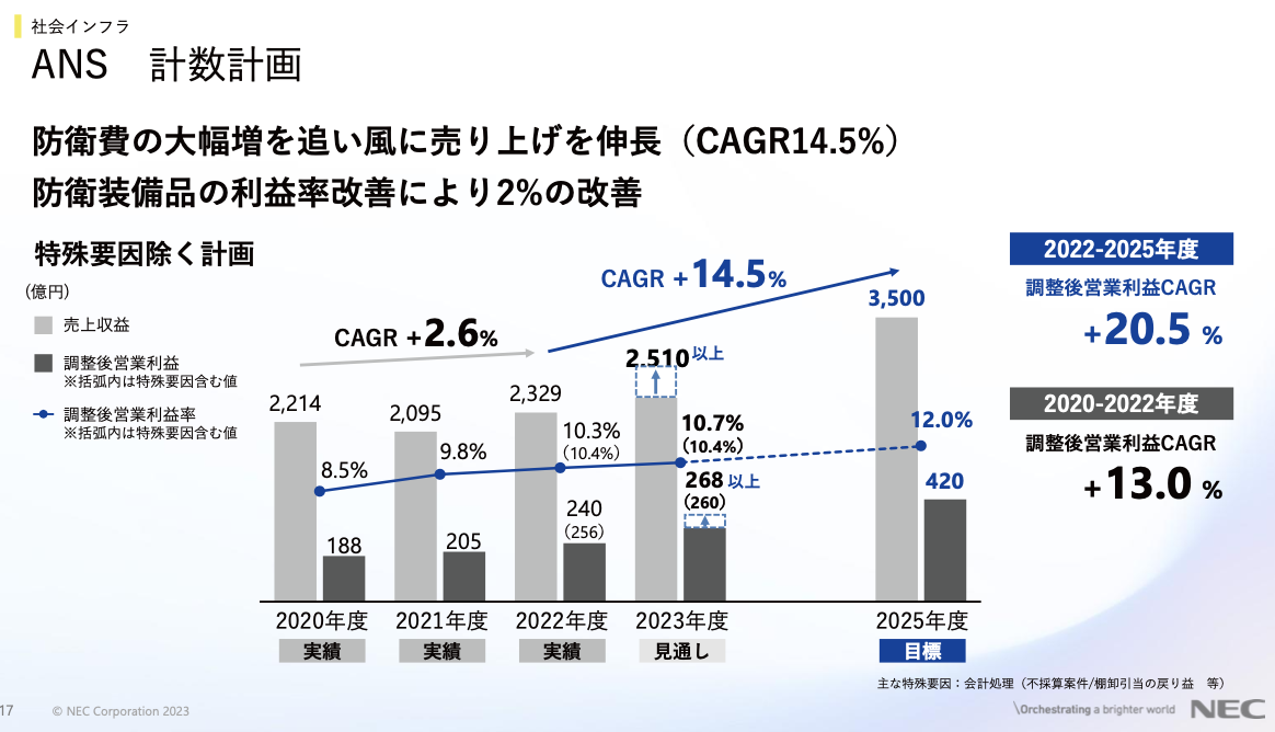 NECでは防衛費増強の影響により防衛関連事業の売上高を2026年3月までに3,500億円、営業利益420億円まで伸長させる計画です。