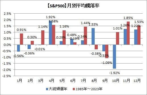 青グラフは1988~2020年の大統領選年の平均騰落率、赤グラフは1985~2023年の全ての年の平均騰落率です。