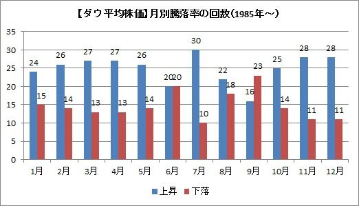 ダウ平均では9月に上昇が16回、下落は23回でした。9月以外は全て株価の上昇が下落を上回っているのに、です(6月は同数)。