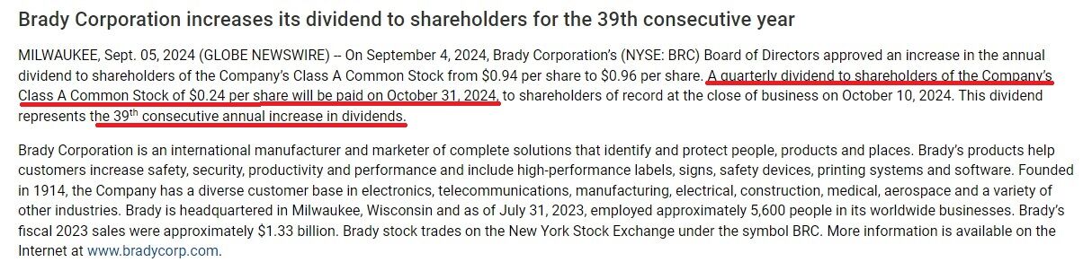 工業用識別ソリューションメーカーの米ブレイディ(BRC)が連続増配39年目となる増配を発表しましmた。