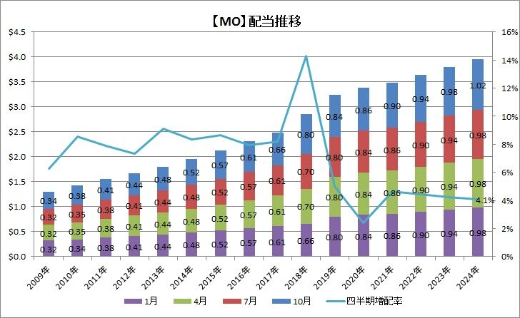 そうだ。今回、アルトリアは四半期配当を増配していたんでした。従来は0.98ドルで、今回は1.02ドルなので、4%ほど増配されています。