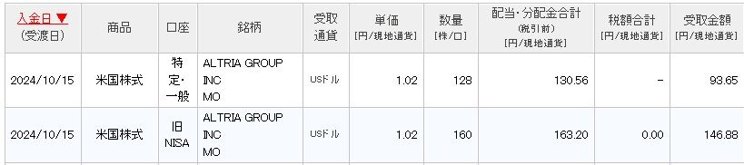 単価1.02ドルに、数量128株で、税引き前は293ドルほどで、手取りは240ドルです。一回あたりの受取額としては、ブリテッシュ・アメリカン・タバコ(BTI)に次ぐ多さだと思います。