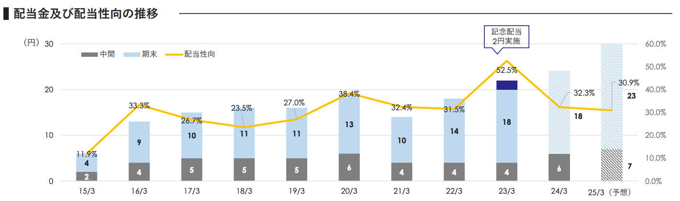 2025年3月期までの中期経営計画期間では配当性向30~35%の目標を設定しているミラースHDは2022年度より4期連続増配予定です。