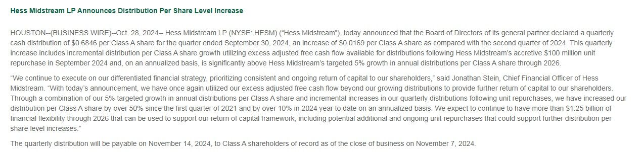 ヘス・ミッドストリーム(HESM)が11月四半期分配金を発表しました。