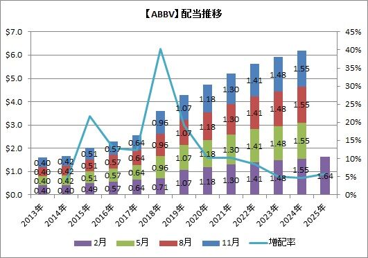 アッヴィ(ABBV)が2025年2月支払の四半期配当を発表しまして、単価を従来の1.55ドルから新たに1.64ドルに増配するとしました!!
