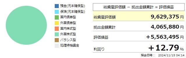 拠出額は406.5万円、評価損益は556.3万円となっており、単純に拠出額の2倍以上の資産評価額となっています。
