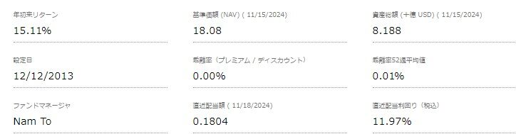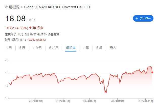 QYLDの現在株価は18.08ドルです。年初来では+4.93%となっています。11月15日の取引でナスダックが大きく下げたので、こちらも影響がありました。