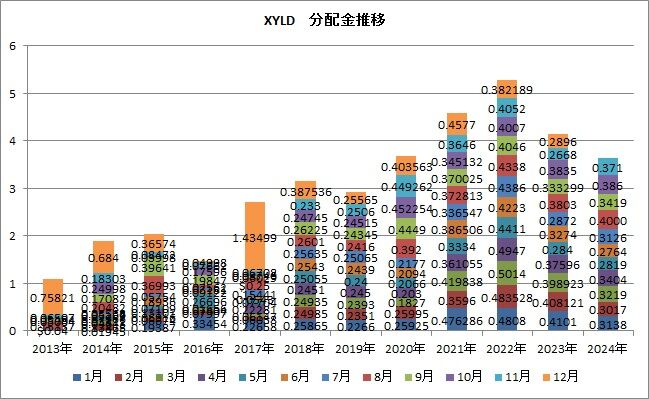 XYLDの1~11月の累積分配金は3.6476ドルなりまして、前年同期より5.4%下回っています。年間分配金で増配をするには、12月に0.4976ドル以上が必要ですが、今の株価を考えると厳しいでしょう。