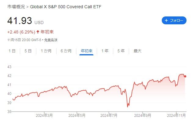 株価は41.93ドルで、年初来+6.29%です。株価自体はQYLDよりパフォーマンスが安定しているようです。
