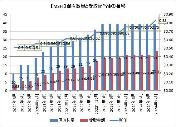 下のグラフはマイクロソフトの株数、配当受取金額、単価の推移です。