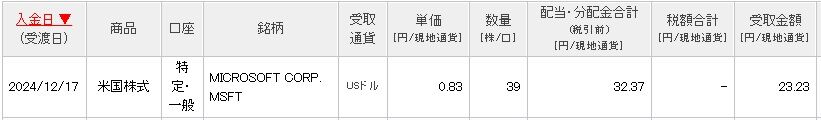 マイクロソフト(MSFT)から今年最後の四半期配当の入金がありました。