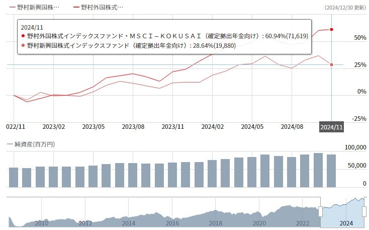 ただ2022年11月からの基準価額の上昇率は、外国株インデックスが60.94%に対し、新興国株式インデックスは28.64%でした。2倍近い開きがあるので、ここの機会損失が大きいです。