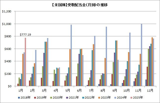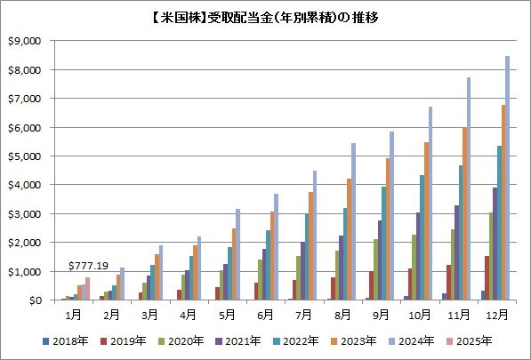 2024年は8,477.18ドルを受取りまして、2025年は10,000ドルを目標にしています。今月は777.19ドルなので、進捗率は7.8%ですね。