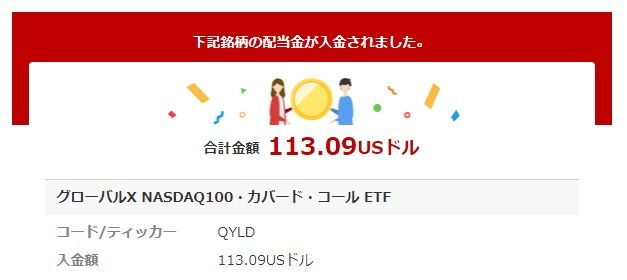 QYLDからは今月2回目ですね。昨年12月分が1月上旬に入金され、今回は1月分です。単価は0.1877ドル、保有数量は708株で変わらずで、税引き後113.09ドルでした。