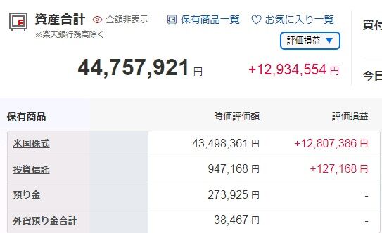 資産額の内訳ですが、米国株式が4,349.8万円(前月末比2.1%増)、投資信託が94.7万円(同11.0%増)、預り金が27.3万円、外貨預り金が3.8万円でした。