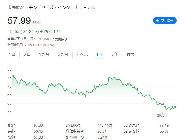 モンデリーズ・インターナショナル(MDLZ) 6株 単価60.22ドル