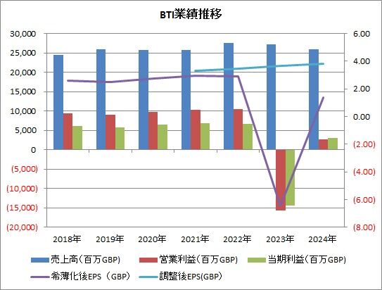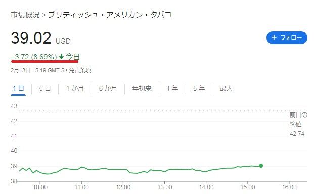 ブリテッシュ・アメリカン・タバコ(BTI)が通期の決算を発表しまして、株価が8%以上下げる急落となりました。