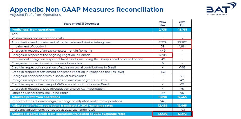 ちょいと分かりづらいのですが、ブリテッシュ・アメリカン・タバコの発表資料では以下のようにNon-GAAPの調整項目が書かれています。