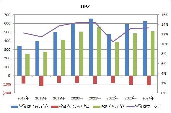 キャッシュフローだけ確認しておきますが、2024年の営業CFは6.24億㌦(前年比6%増)、投資支出は1.12億㌦(同7%増)、フリーCFは5.12億㌦(同5%増)でした。
