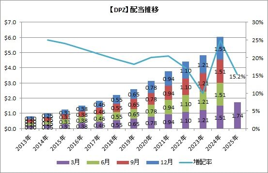 ドミノ・ピザの前回の増配は1.21㌦→1.51㌦への24.8%増配でしたので、それに比べるとかなり増配率は落ちてしまっていますが、それでも15%増配は普通に考えてかなり高い水準です。