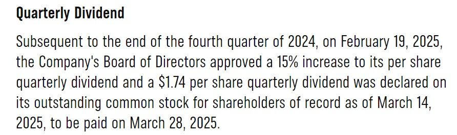 プレスリリースによると、一株当たりの四半期配当は1.74㌦で、前期比15%増配となりまして、権利確定日は3月14日、支払日は3月28日とのことです。