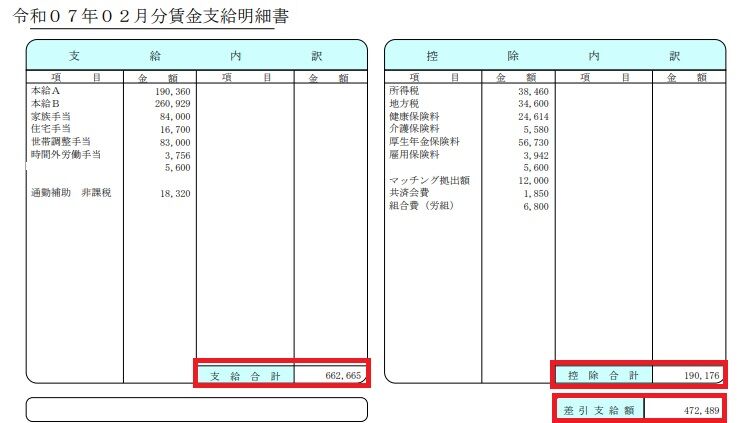 やばいっすね、、。なので、差引支給額として24年2月45.3万円に対して、25年2月は47.2万円で、ほんの2万円弱しか増えていないのが実態です。