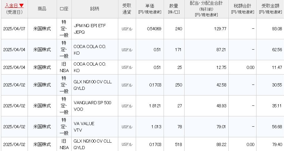 4月に入って5日目ですが、すでに以下の通り、5銘柄から369㌦ほどの配当・分配金の入金がありました。