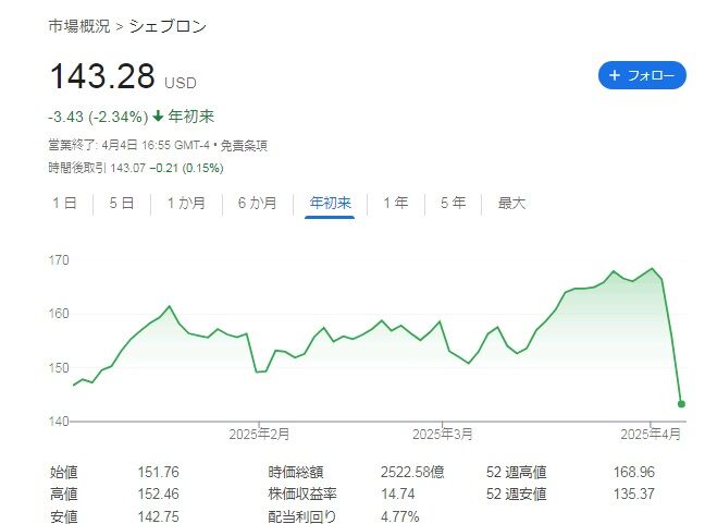 151㌦で買ったのは良いのですが、その後もトランプ関税の影響か株価は下がり続けまして、4日は143.28㌦まで下げました。買い増して、すぐに含み損です、、。