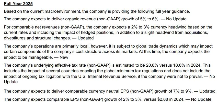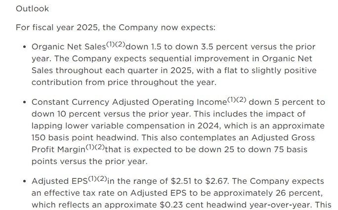 通期見通しは従来と変わらずでして、オーガニック・ネットレベニューは前年比5%減、調整後一株利益は10%減となっています。