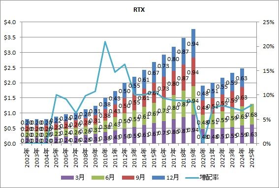 そのRTXは次回四半期配当を0.68ドルとし、従来の0.63ドルから7.9%増配すると発表しました。支払日は6月12日、権利確定日は5月23日です。