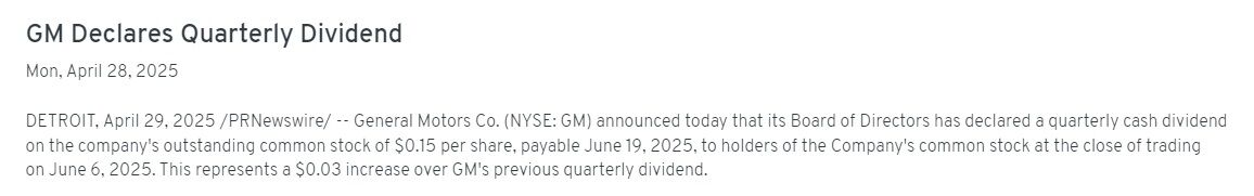 GMは前回の四半期配当でも増配を発表していましたが、6月支払分でも増配となっており、2四半期連続増配です。
