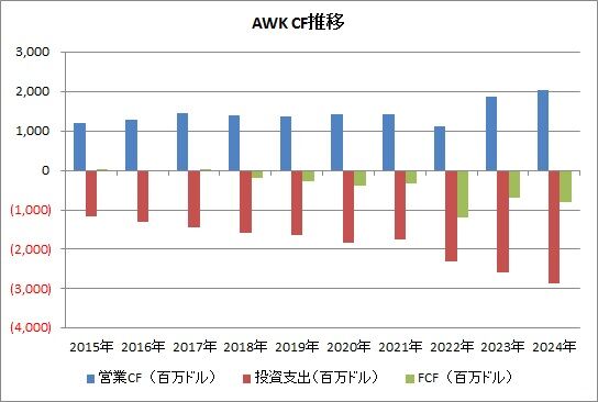 2024年の年間営業CFは20.45億ドル(前年比9.1%増)は良かったのですが、投資支出は28.56億ドル(同10.9%増)となり、FCFは8.11億ドルのマイナスとなりました。FCFのマイナスは毎年のことではあるものの、、、