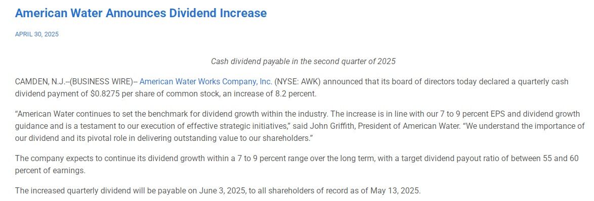 アメリカン・ウォーター・ワークスによると、次回四半期配当を0.8275ドルへと従来から8.2%増配するとのことです。支払日は6月3日、権利確定日は5月13日です。